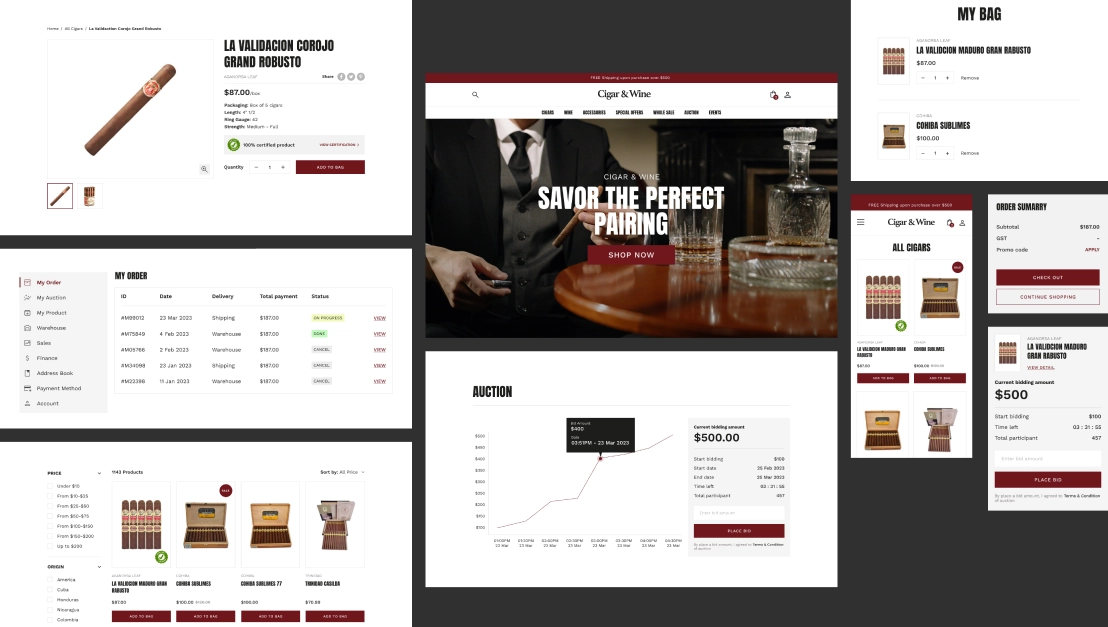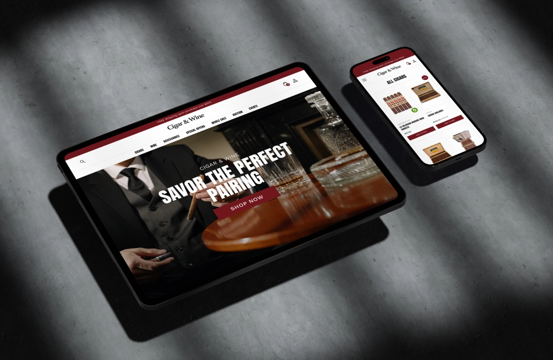 Cigar & Wine is an e-commerce platform dedicated to offering premium cigars and fine wines to connoisseurs and enthusiasts. Their unique approach combines traditional sales with a dynamic bidding system, giving customers the opportunity to access exclusive products. Cigar & Wine sought to establish a compelling digital presence that reflected their luxury brand and catered to their niche audience.
